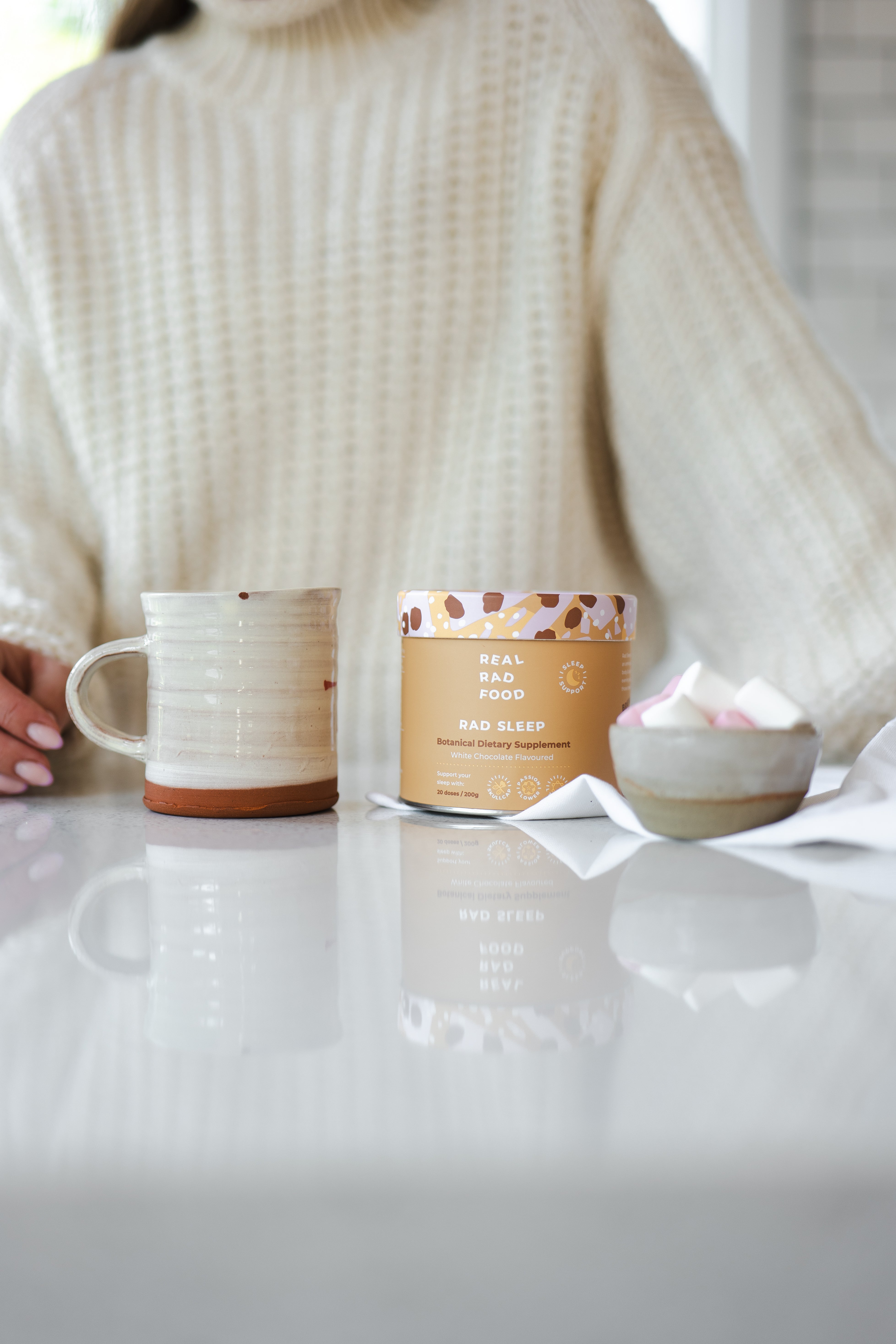 Rad Sleep is a Botanical Dietary Supplement designed to support relaxation in your mind, body & soul. Rad Sleep contains a functional blend of herbs & an amino acid that not only taste amazing in our hot chocolate formula but work to support you in winding down into a delicious deep sleep every evening.